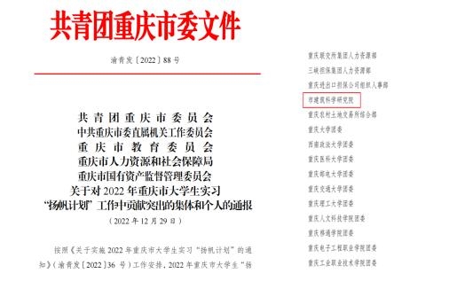 近日,市委直屬機關工委、市教委、市人力社保局、市國資委、團市委對在 2022 年重慶市大學生實習揚帆計劃工作中做出突出貢獻的 97 個組織、 95 名工作者以及表現出色的220 名優秀學生進行通報。其中,重慶市建筑科學研究院有限公司(以下簡稱公司)獲得貢獻突出組織稱號,公司黨委辦公室實習學生程慶(重慶交通大學)獲得表現出色個人稱號。