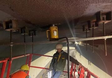 該項檢測工作時間緊、任務重,檢測操作難度較大。為了更好地完成檢測工作,公司立即組織相關人員成立專項技術小組并召開技術論證會,隨后及時安排人員開展現場檢測工作,由于該隧道交通通行壓力較大,檢測工作選擇在晚上10點后進行,并協調重慶市渝中區交警支隊進行交通導行,在移動吊車、自卸式起重車等多種特種作業設備的支持下,爭分奪秒,于凌晨3點順利完成了風機吊架承載力檢測工作。