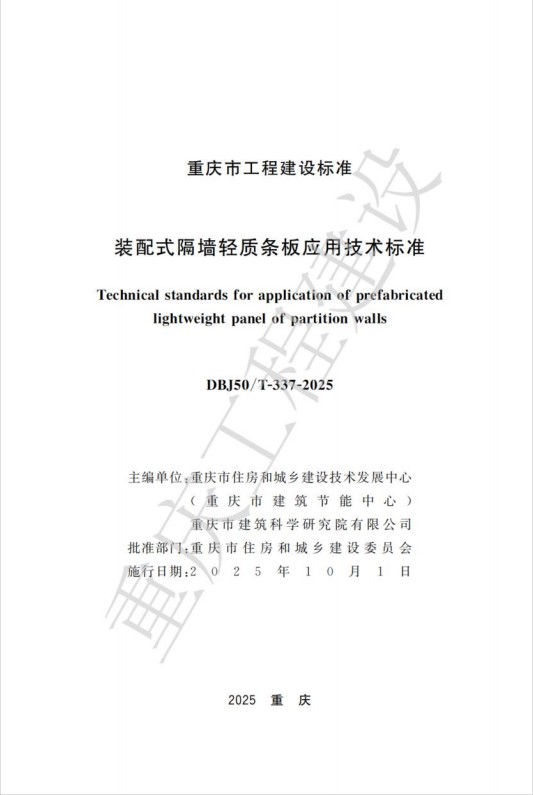 近日,由重慶設(shè)計(jì)集團(tuán)所屬子企業(yè)重慶市建筑科學(xué)研究院有限公司(以下簡(jiǎn)稱(chēng)“市建科院”)聯(lián)合重慶市住房和城鄉(xiāng)建設(shè)技術(shù)發(fā)展中心編制的重慶市工程建設(shè)標(biāo)準(zhǔn)《裝配式隔墻輕質(zhì)條板應(yīng)用技術(shù)標(biāo)準(zhǔn)》(DBJ50/T-337-2025)通過(guò)了重慶市住房和城鄉(xiāng)建設(shè)委員會(huì)的審批并發(fā)布,將于2025年10月1日起開(kāi)始實(shí)施。